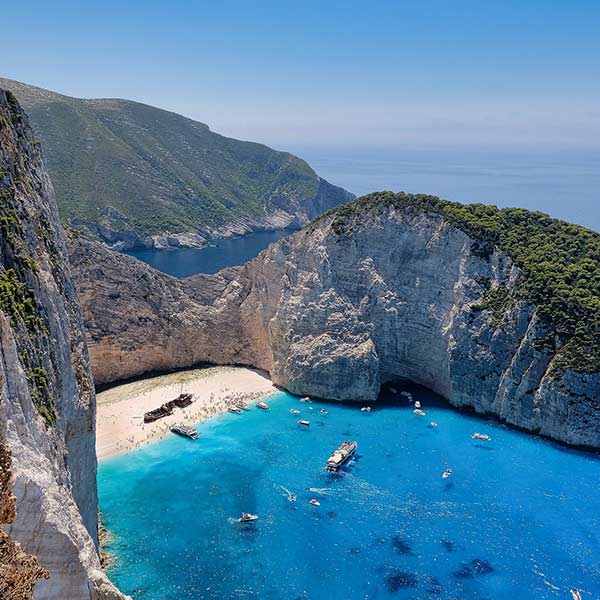 Auf Zakynthos waren einst die Schmuggler zu Hause – und so gilt für viele Reisende die sagenhafte Navagio Bucht als einer der schönsten Strände. Der weiße Sand strahlt mit der Sonne um die Wette und das rostige Schiffswrack bildet eine spektakuläre Kulisse. Es stammt allerdings nicht aus dem Mittelalter, sondern wurde im Herbst 1980 von der griechischen Küstenwache verfolgt. Weil das Wetter ungünstig war, strandete es und liegt bis heute dort. Die Bucht selbst wird von eindrucksvollen Klippen umrahmt und liegt im Norden von Zakynthos. Nur die Anreise ist nicht so einfach: Wenn du hierher möchtest, musst du mit dem Boot kommen.